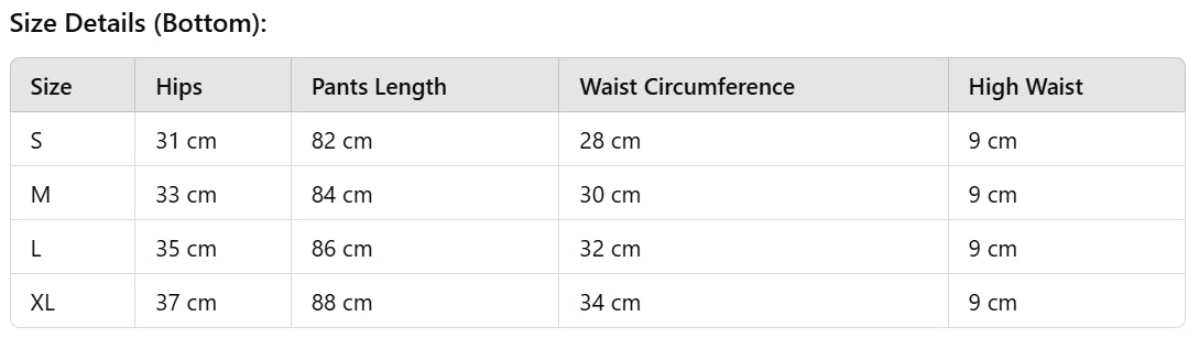 S (Waist 28 cm / Hips 31 cm) • M (30 / 33 cm) • L (32 / 35 cm) • XL (34 / 37 cm)